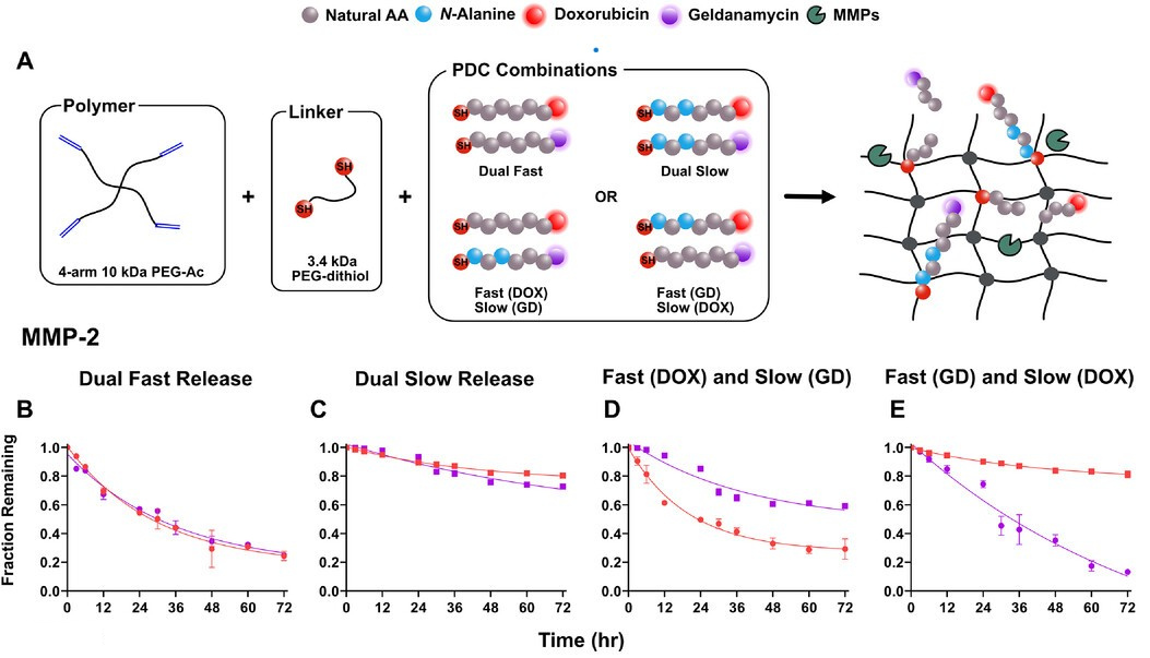 Our lab recently published some recent exciting work in Advanced Healthcare Materials! When treating cancer, simultaneous use of multiple therapeutics can result in powerful synergistic effects, but achieving independent release can be challenging. To accomplish this, we make selective peptoid modifications to protein sequences degradable by matrix-metalloproteinases (MMP) which result in several peptomer sequences with distinct and controllable degradation rates. By tethering multiple different peptomer sequences into a hydrogel and attaching different drugs to the end of each one, we can independently control each drug’s release kinetics (“slow,” or “fast”). This presents some exciting possibilities in design of new multidrug cancer therapeutic systems! Check it out here!